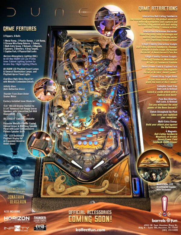 Featuring world-class sculpts, innovative mechanisms, immersive theme integration, and music from Hans Zimmer’s rousing score along with other original complimentary tracks, Dune is a pinball experience unlike any other: