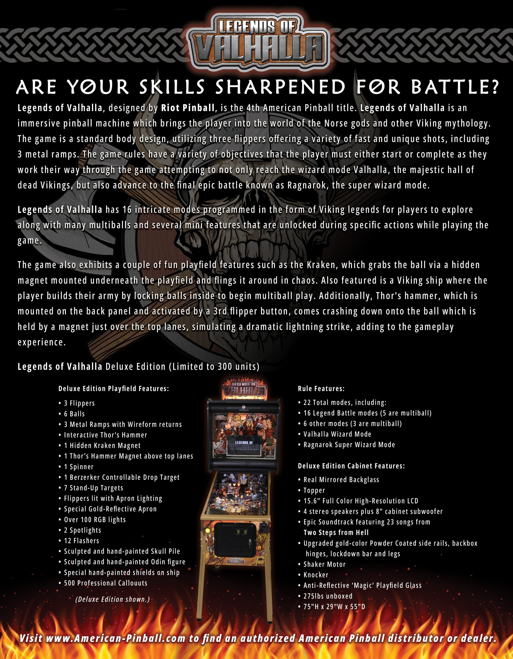 Legends of Valhalla, designed by Riot Pinball, is the 4th American Pinball title. Legends of Valhalla is an immersive pinball machine which brings the player into the world of the Norse gods and other Viking mythology. The game is a standard body design, utilizing three flippers offering a variety of fast and unique shots, including 3 metal ramps. The game rules have a variety of objectives that the player must either start or complete as they work their way through the game attempting to not only reach the wizard mode Valhalla, the majestic hall of dead Vikings, but also advance to the final epic battle known as Ragnarok, the super wizard mode.