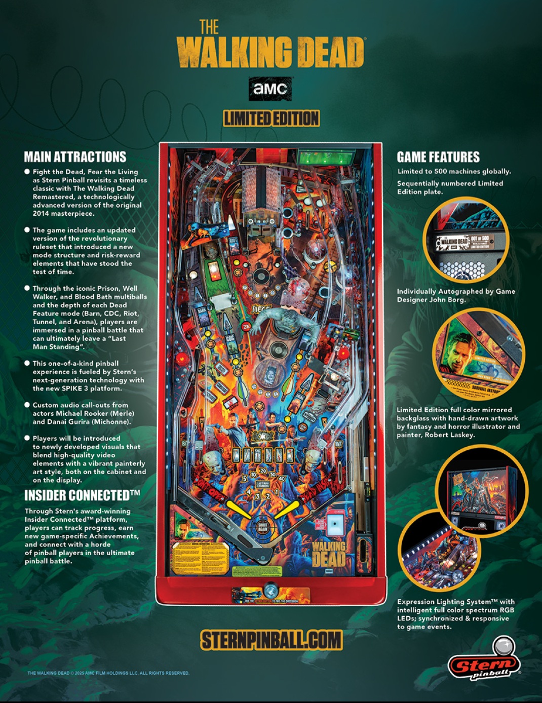 Limited to 500 games globally, the highly collectible Limited Edition model includes the updated Expression Lighting System™ and Speaker Expression Lighting System with The Walking Dead-themed game effects, a full-color mirrored backglass, full-color high-definition cabinet decals, exclusive custom The Walking Dead Remastered pinball armor, a custom designer-autographed bottom arch, upgraded audio system, anti-reflection pinball playfield glass, shaker motor, a sequentially numbered plaque, a signed Certificate of Authenticity, and a digital Insider Connected LE owner’s badge on registration.