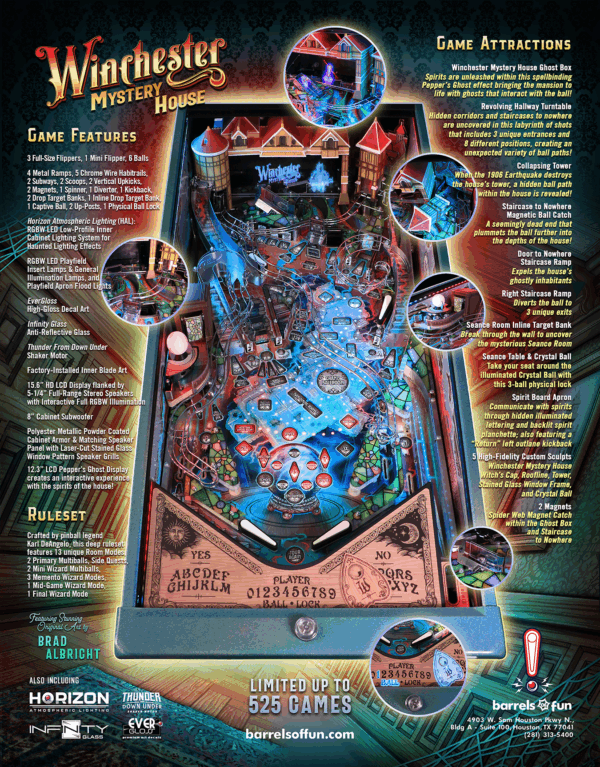 Winchester Mystery House® Pinball is currently in production and being manufactured by Barrels of Fun LLC., a luxury pinball manufacturing company based in Houston, Texas and is limited up to 525 units worldwide.